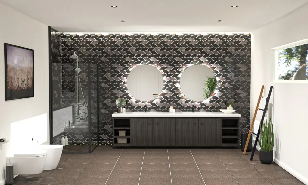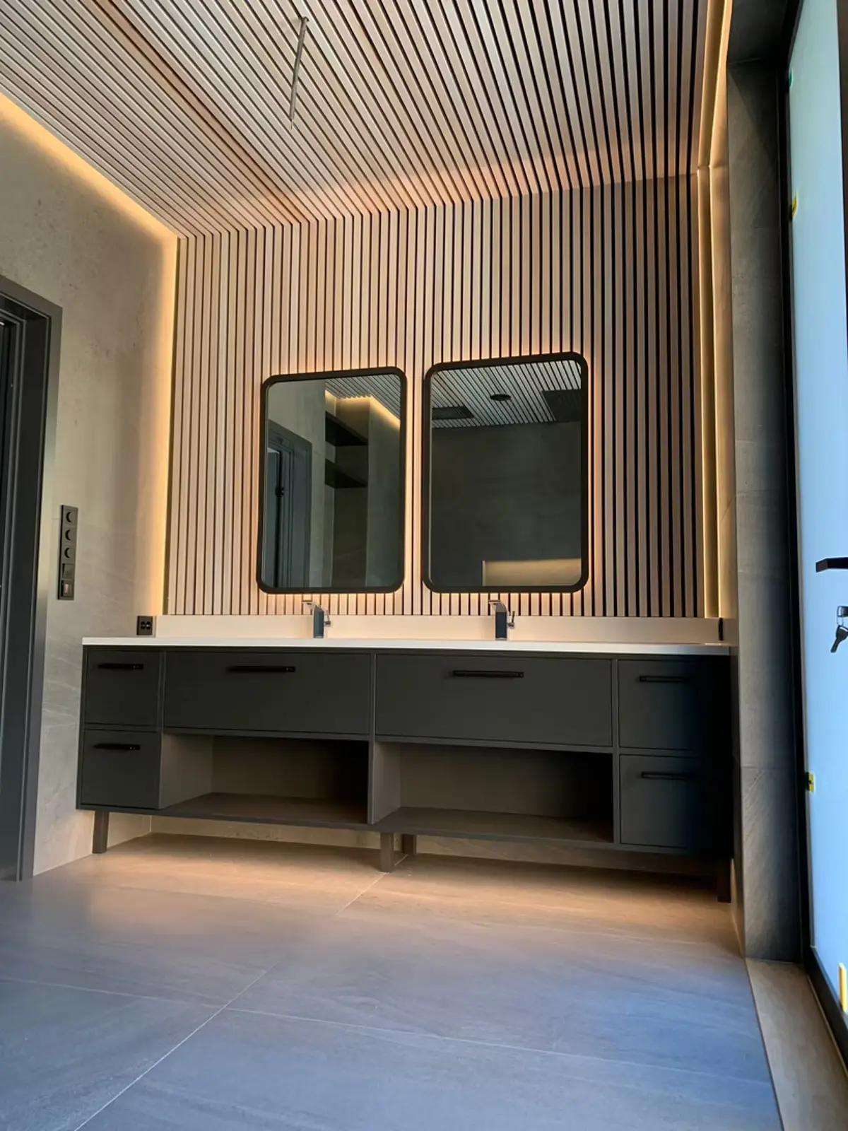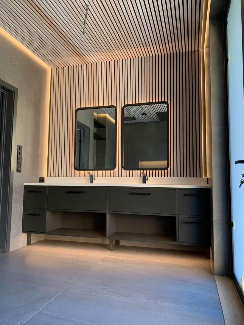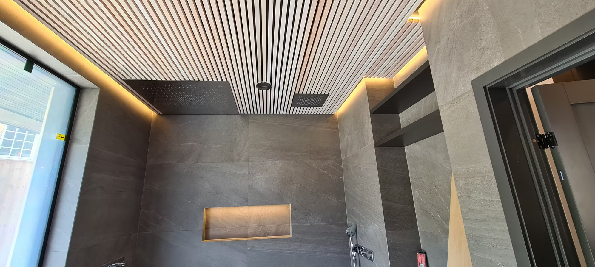 Vi har også lagt inn LED striper bak spilevegger i eik, under servantskap og på bakside av speil for å lage kontraster.