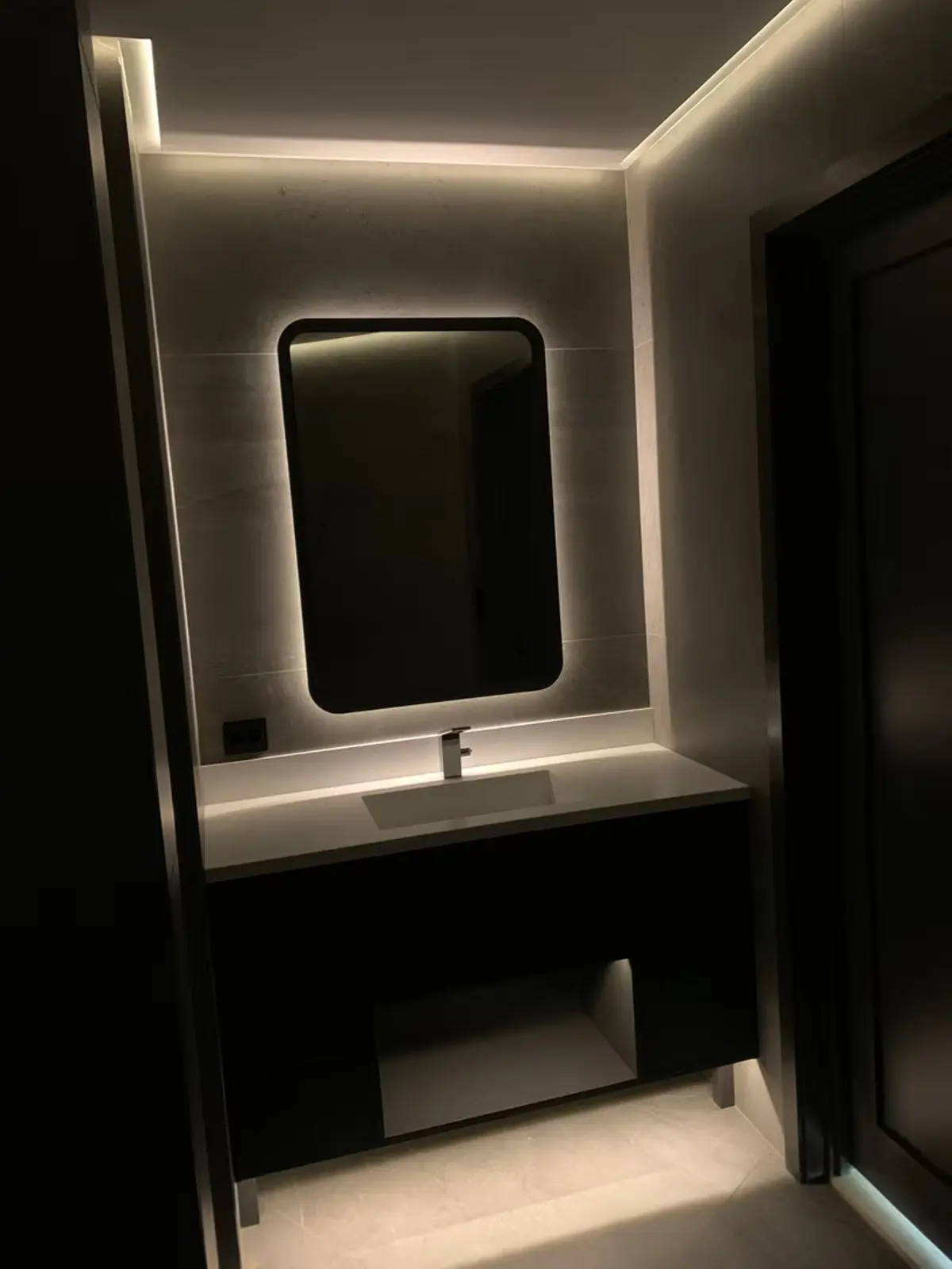 Her hadde kunden ett ønske om at alt lys skulle være indirekte. Vi har benyttet oss av LED striper i nisjer som er skjult i topp av disse for usynlig plassering. LED striper i tak som gir en opplevelse av svevende tak.