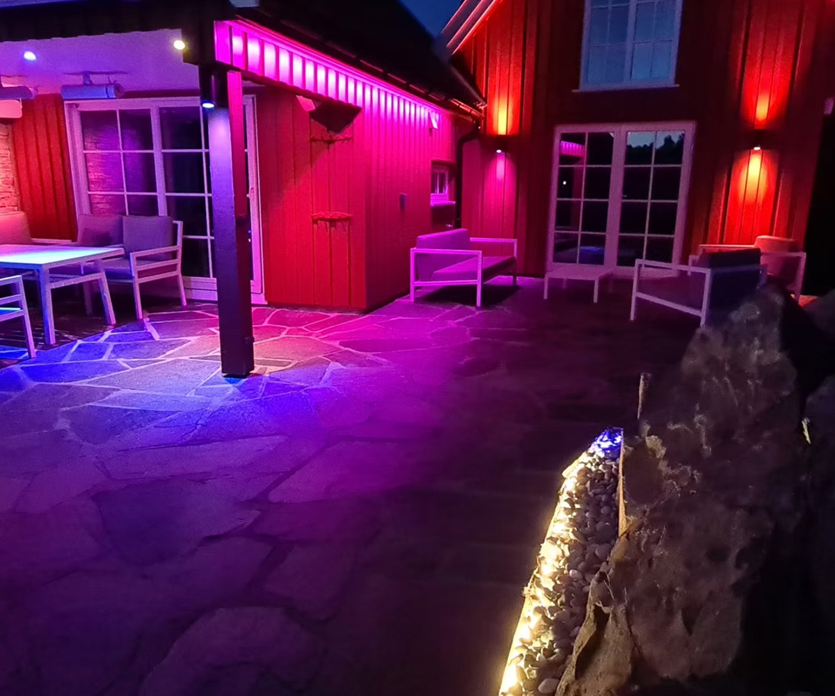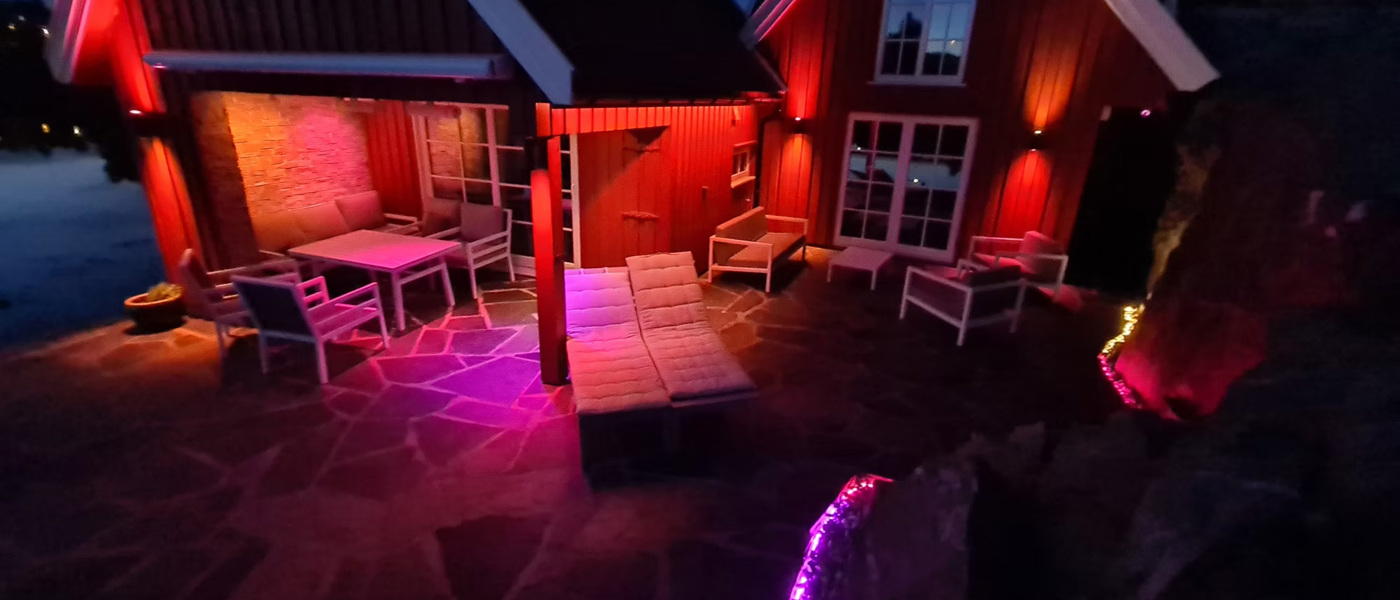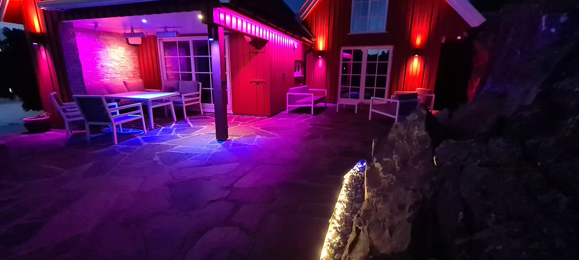 Denne hytteeieren ønsket noe spesielt for uteområdet. Her har vi brukt RGBW led lys i alle armaturer og striper. Alle lys kan stilles individuelt med den fargen man ønsker. Vi har satt opp en app for mobil som lager scener med forskjellige farger slik at uteområdet blir levende og spennende. Lyset her kan kobles til Spotify slik at du kan høre på favorittmusikken din samtidig som lyset endrer seg i takt med musikken. Må oppleves for å få riktig inntrykk.