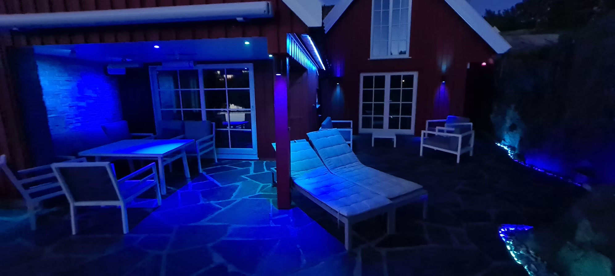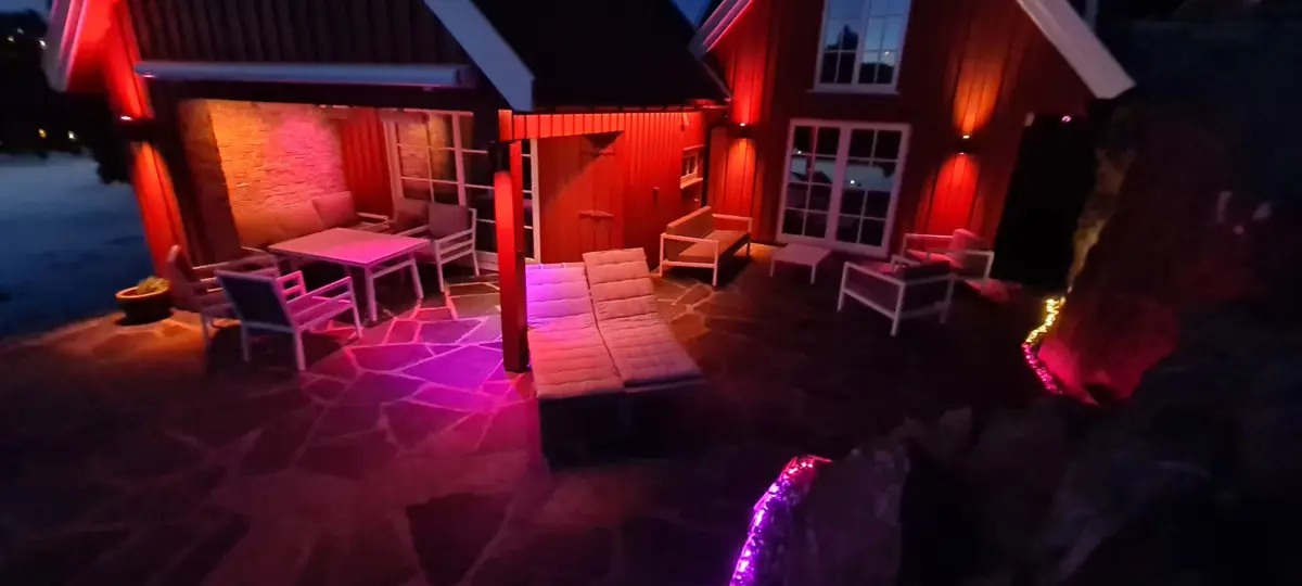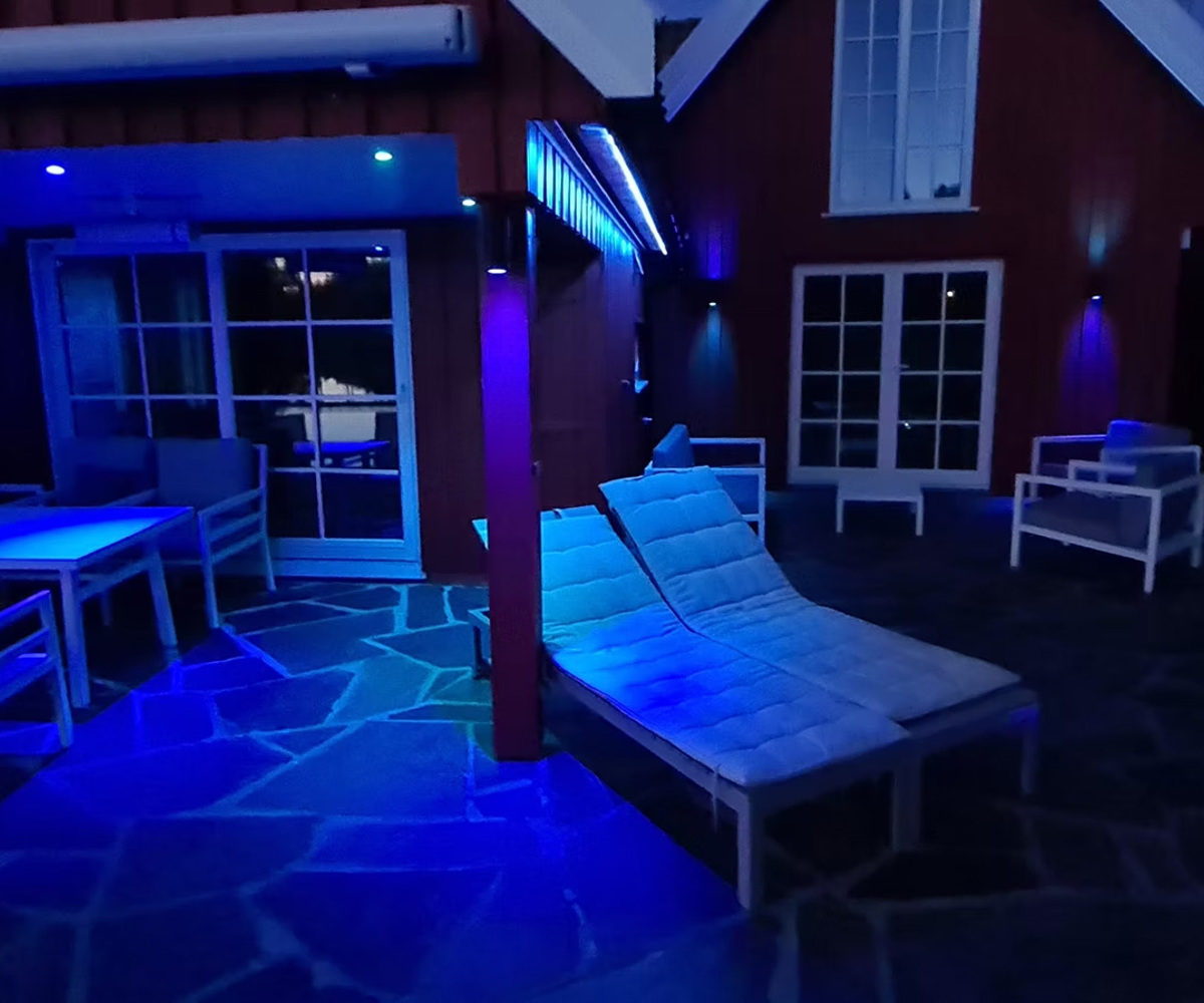 Denne hytteeieren ønsket noe spesielt for uteområdet. Her har vi brukt RGBW led lys i alle armaturer og striper. Alle lys kan stilles individuelt med den fargen man ønsker. Vi har satt opp en app for mobil som lager scener med forskjellige farger slik at uteområdet blir levende og spennende. Lyset her kan kobles til Spotify slik at du kan høre på favorittmusikken din samtidig som lyset endrer seg i takt med musikken. Må oppleves for å få riktig inntrykk.