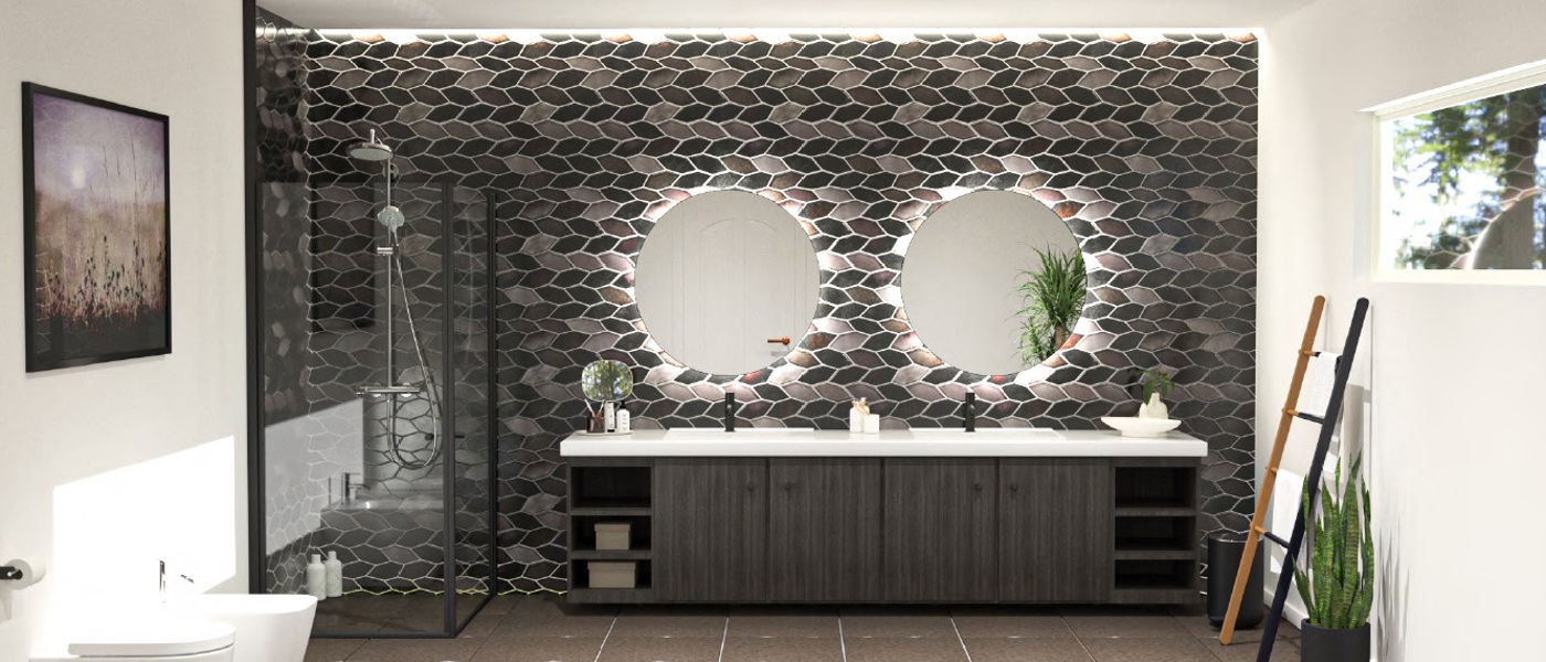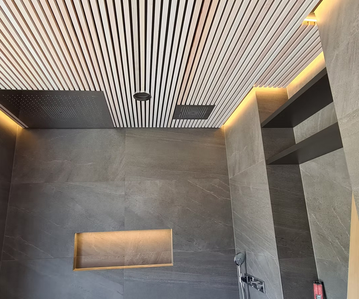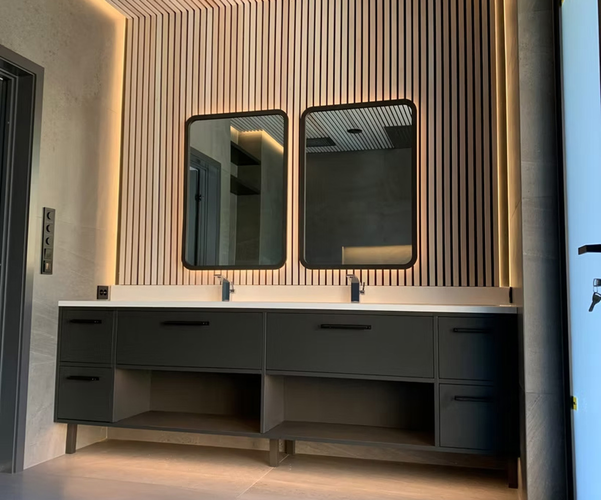 Vi har også lagt inn LED striper bak spilevegger i eik, under servantskap og på bakside av speil for å lage kontraster.