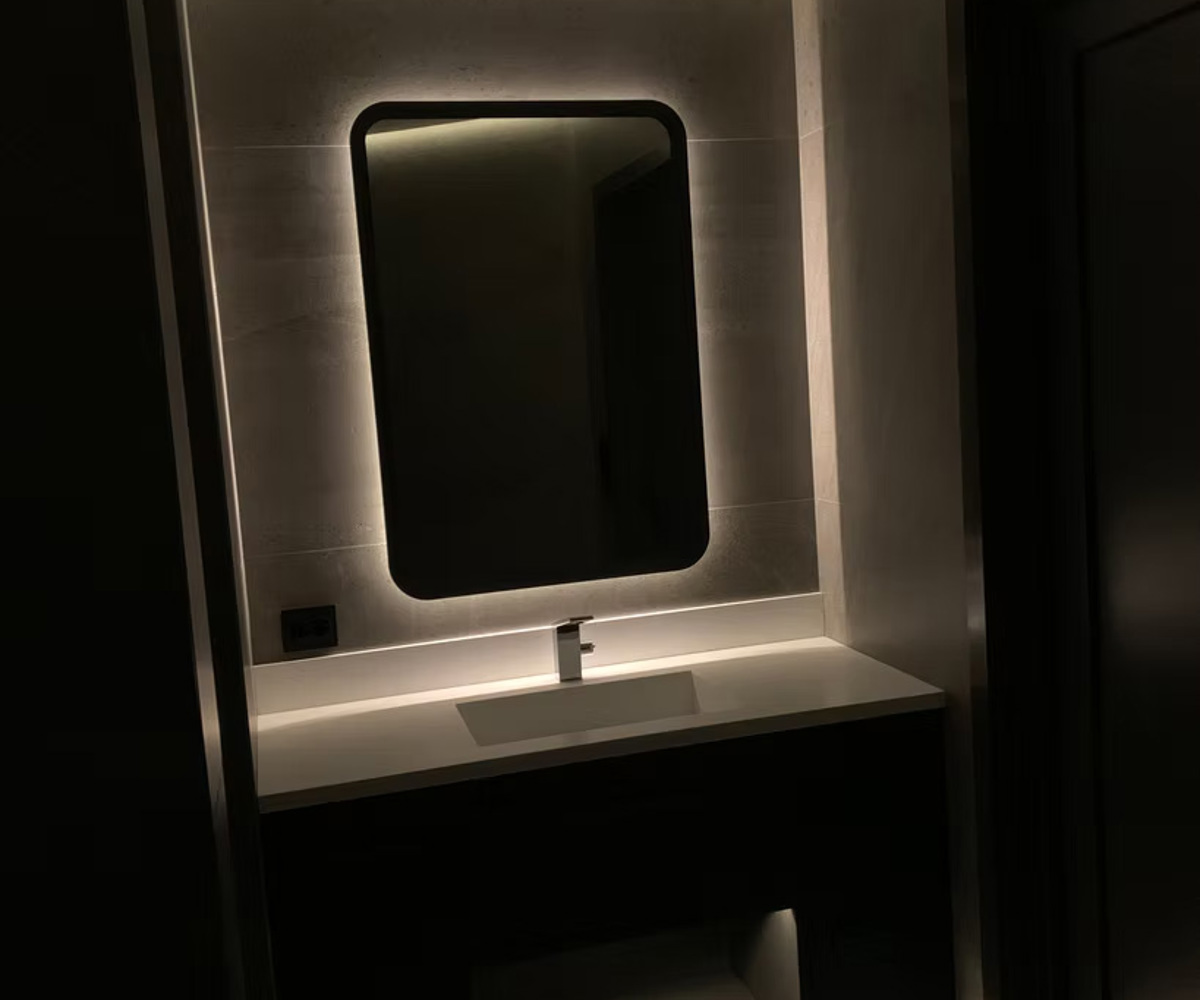 Vi har benyttet oss av LED striper for å lyse opp dette badet. Kontakt oss for gode ideer til belysning.